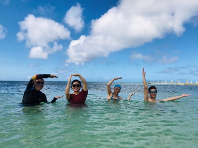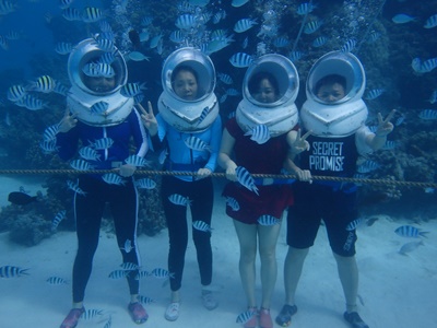 虽然潜水再次以失败告终,但至少戴着能让你在水中自由呼吸的“头盔”,还是下到了并不算深的海底,鱼儿密密麻麻蜂拥而至的时候,到底还是开心的,嘴巴没有合拢过,喂食、合影,好不欢乐!